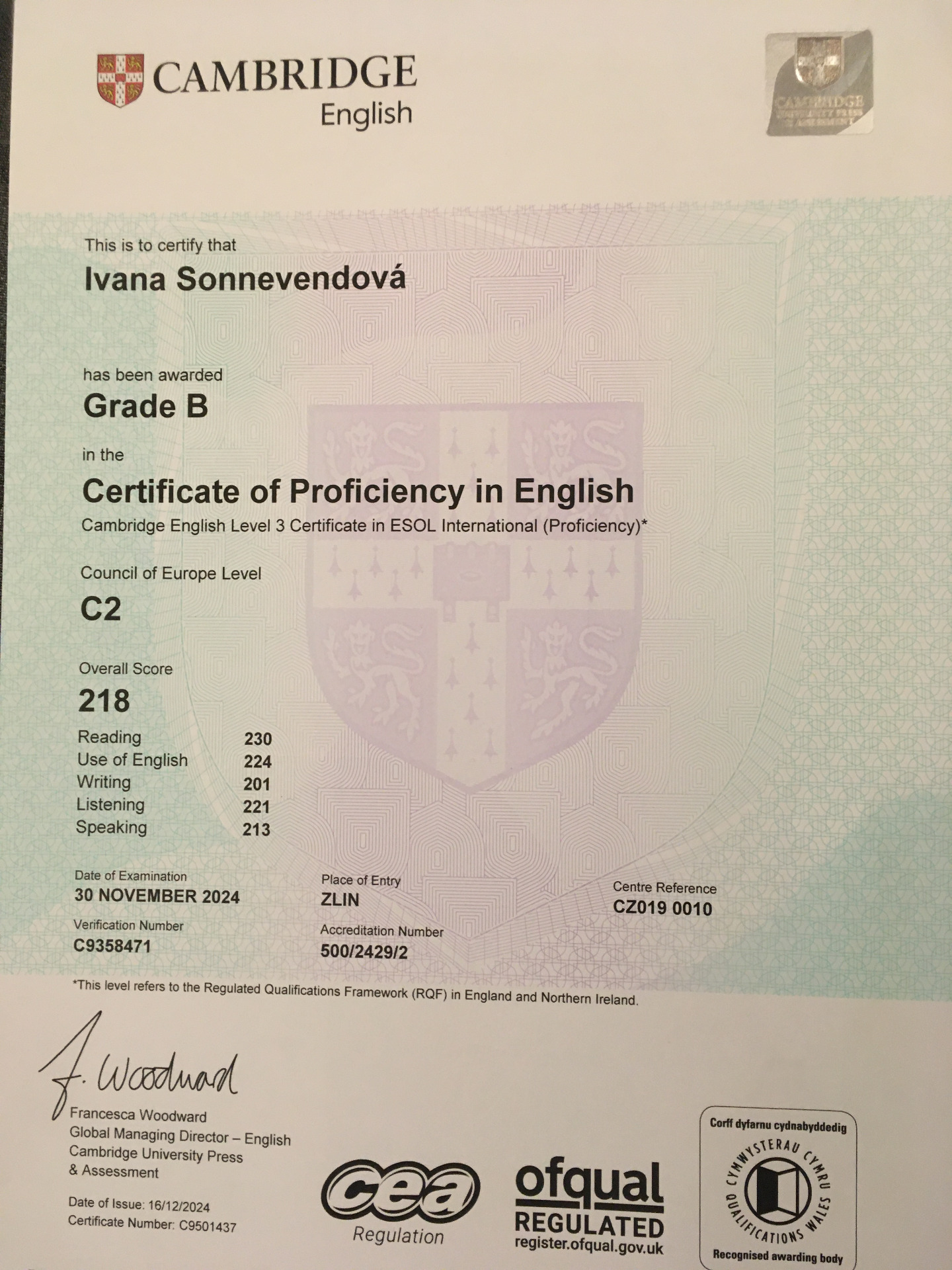 Mám certifikát Cambridge Proficiency Exam CEFR úroveň C2 - tedy nejvyšší.
